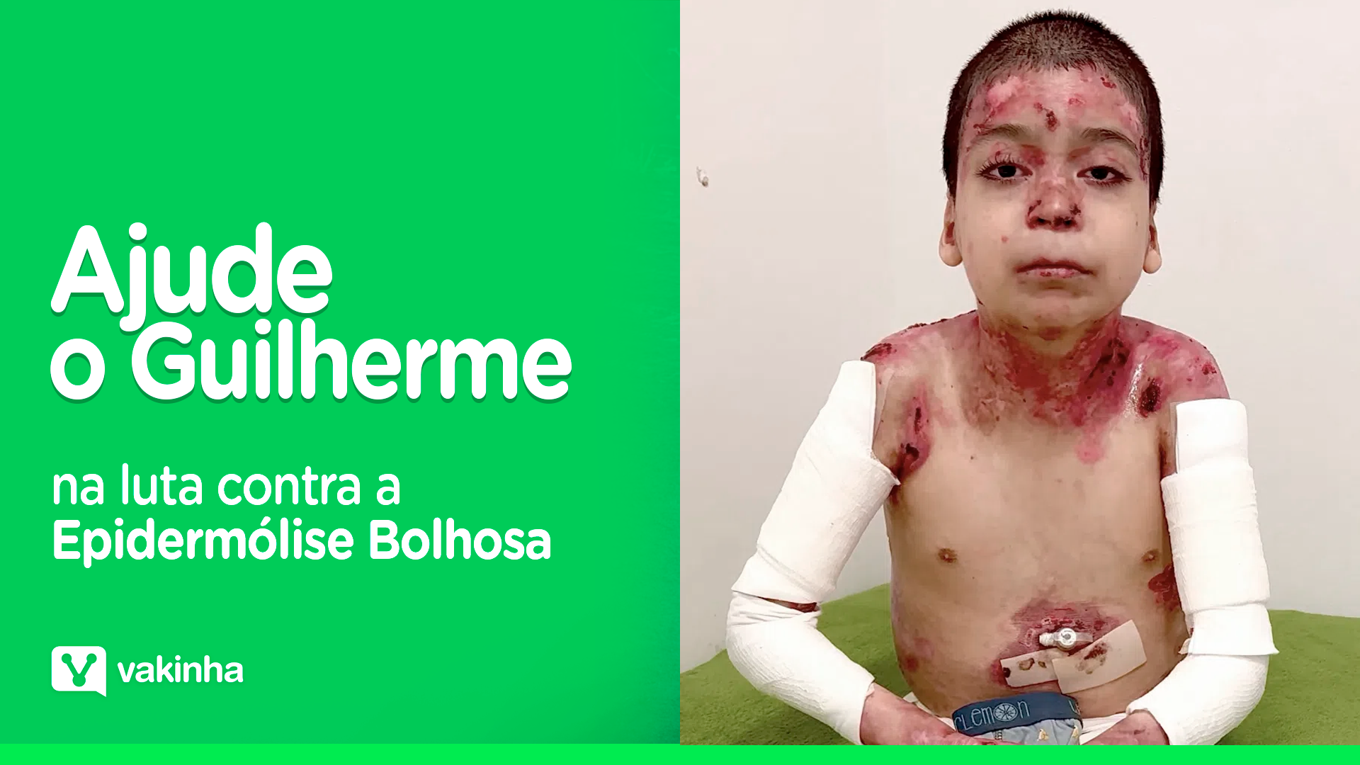 O Guilherme sofre de Epidermólise Bolhosa, uma doença rara, cruel e dolorosa, que faz com que a pele dele se machuque, se queime e se solte com qualquer toque. Só quem vê de perto entende a dor de uma criança que já perdeu as mãozinhas, que não consegue comer, que só se alimenta por sonda e que sente dores todos os dias.